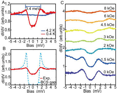 K时样品处于非超导态。(B) 0.4 K超导dI/dV谱和各向同性BCS超导谱的对比。(C) 0.4 K时,不同磁场下的超导dI/dV谱,超导能隙被外加磁场所抑制。 |