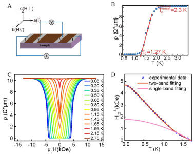 超导转变温度附近的电阻率-温度关系。(C) 各个温度和磁场下的电阻率。(D)