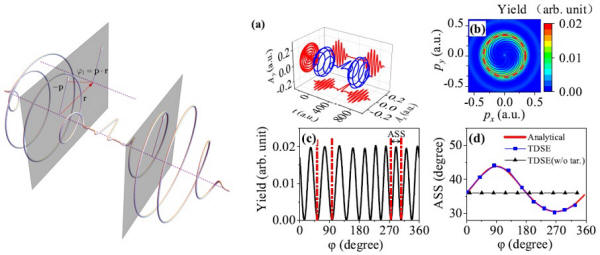 秒)内作用于电子使电子产生约0.1纳米(1纳米=10-9米)量级的空间位移。利用超短超强激光脉冲,人们将可以实现分子尺度下的电子位置的超快及超高精度的位置控制。然而现有的探测技术,却无法实现对电子如此微小位移的精确测量。隧道扫描显微镜(STM)利用的电子量子隧穿信号能以0.1纳米的横向和0.01纳米的纵向分辨率对静止的原子进行成像,却无法对运动中的电子进行成像。光电子显微镜(PEEM)成像系统虽然可以测量运动电子的位置,但是其最好的分辨率仅能达到约3纳米,无法在0.1纳米的尺度进行位移测量。日前,该团队利用强场电离中的时间双缝干涉图样,提出对电子在激光脉冲下的微小位移进行了测量的新方案,该方案的分辨率可达0.01纳米。为了测量电子在超短脉冲作用下的位移,他们把导致电子位移的超短脉冲置于两束较长反向旋转的圆偏振光之间。两束反旋向的圆偏振光先后分别电离电子,构成时间上的电子波包双缝干涉,这在电子动量谱中产生涡旋结构。在没有中间的超短脉冲时,该涡旋结构角向是均匀分布的。当中间加入了一束任意的被测超短脉冲,它将作用于前一圆偏光电离的电子使之产生微小位移,这个微小位移使得电子波包获得一个额外相位,从而导致先后两个电子波包的干涉结构在角方向产生了非均匀性。他们提出通过测量这个非均匀的角向分布,可以准确地提取出电子在超短脉冲作用下产生的亚纳米量级的微小位移。他们的方案对激光的焦斑效应以及两束圆偏振光的相位抖动具有很好的抗干扰能力。该理论方案近期以“Proposal