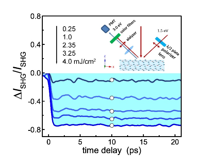 | Figure: Pump induced SHG time traces of MoTe2 at selected fluences