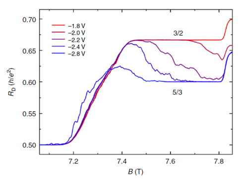 | 图:不同门电压条件下的磁场依赖关系,随着门电压改变局域条件,5/3的量子霍尔平台逐渐演变为令人意外的3/2平台。[Nature