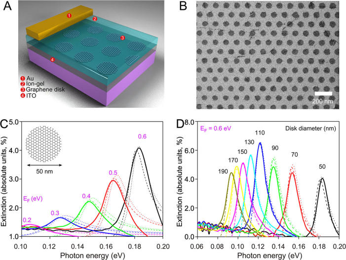 教授(CSIC)合作研究了石墨烯作为一种半金属其本身的表面等离激元共振现象。利用外加门电压的方法对石墨烯单层进行电掺杂,提高石墨烯单层的载流子浓度和费米能,最终在中红外波段探测研究了石墨烯纳米盘(直径50nm)及纳米环(100nm)的电偶极共振及杂化模式,如图2所示,相关论文近期在线发表在ACS