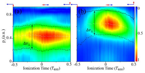 图2. 实验提取的时间分辨的电子波包动量分布。800nm光场强度分别为(a)0.0045a.u.和(b)0.02a.u.,