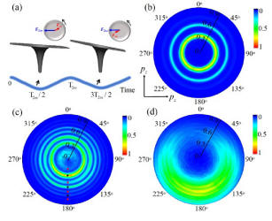 近期,他们实验上通过测量双色同向旋圆偏场中(400nm+800nm)激光强度依赖的电子动量分布,给出了双指针阿秒钟在不同强度比下的统一描述。该工作利用先进的冷靶反冲离子电子动量成像谱仪(COLTRIMS),获得了高动量分辨单色400nm圆偏振激光(图1b)以及不同强度比同向旋转双色园偏振强激光场中的光电子的干涉图案(图1c和1d)。通过与理论模拟
