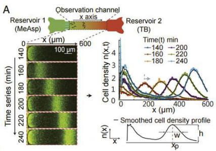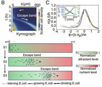 Band”)行为,该行为可以使得细菌群落在复杂的趋化物浓度场中获得更好的生长优势。相关的定量实验与理论研究以“The escape band in