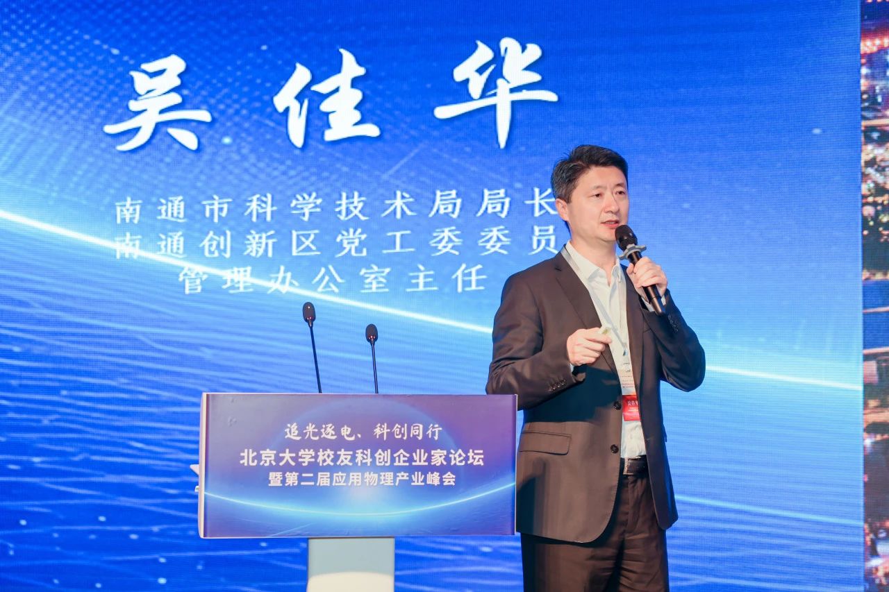 南通市科学技术局局长、南通创新区党工委委员、管理办公室主任吴佳华,北京大学科技开发部部长姚卫浩,北京大学物理学院党委书记刘雨龙,北京大学国内合作委员会办公室副主任欧阳晓玲,北京大学物理学院副院长颜学庆,北京大学人工微结构和介观物理全国重点实验室主任、北京大学长三角光电科学研究院院长刘运全,北京大学长三角光电科学研究院执行院长杨宏,北京大学科技开发部部长助理王新茹,北京大学物理学院教授、飓芯科技董事长胡晓东,北京大学校友会副秘书长、北大上海临港国际科创中心执行主任王宇,北京大学东莞光电研究院副院长童玉珍,广东省新兴激光等离子体技术研究院副院长陈云霞,北京大学校友青年CEO俱乐部副理事长张金荣,北京大学南京校友会副会长宋峰,苏州北大企业家商会秘书长、博雅君子兰创投合伙人张文等嘉宾出席了本次峰会。
