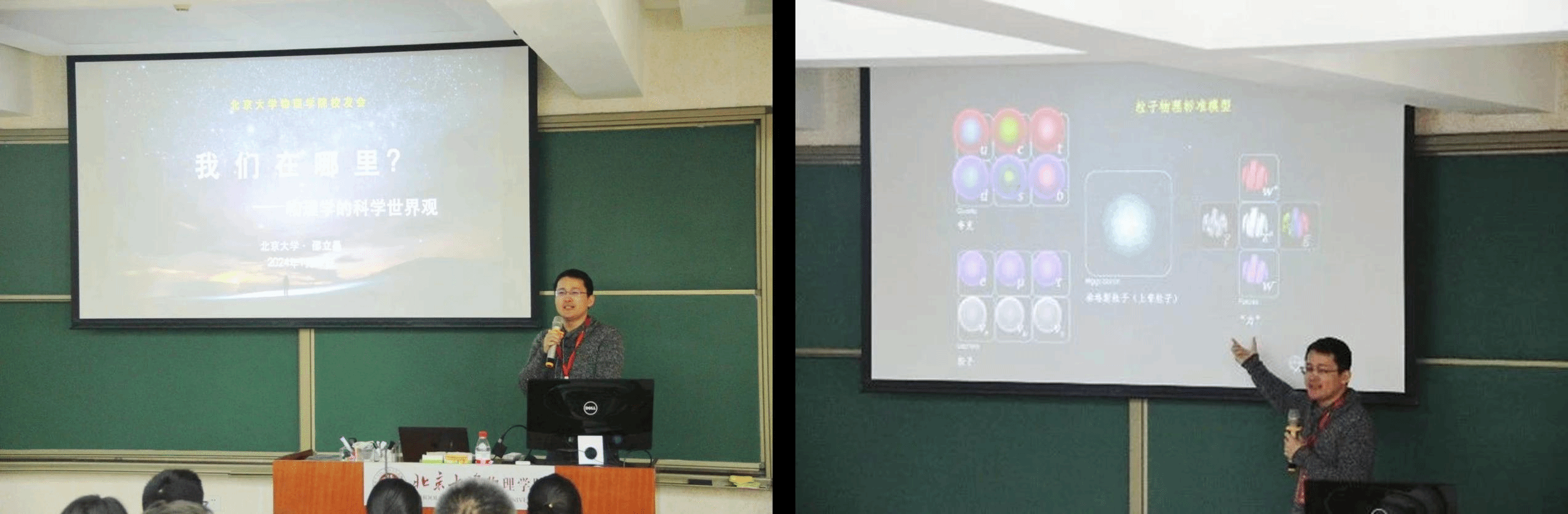 演示实验结束后,科维理天文与天体物理研究所邵立晶老师带来题为《我们在哪里?——物理学的科学世界观》的科普讲座。他由“人生观、世界观、价值观”引出科学的世界观,并围绕“我们处于一个怎样的世界?”、“世界的本原是什么?”、“引力是什么?”等展开,大到银河系,小到夸克,全方位风趣地从物理的角度向大家介绍了这个世界。提问交流环节,同学们以自己感兴趣的物理问题为出发点,与邵立晶老师展开了热烈的讨论。