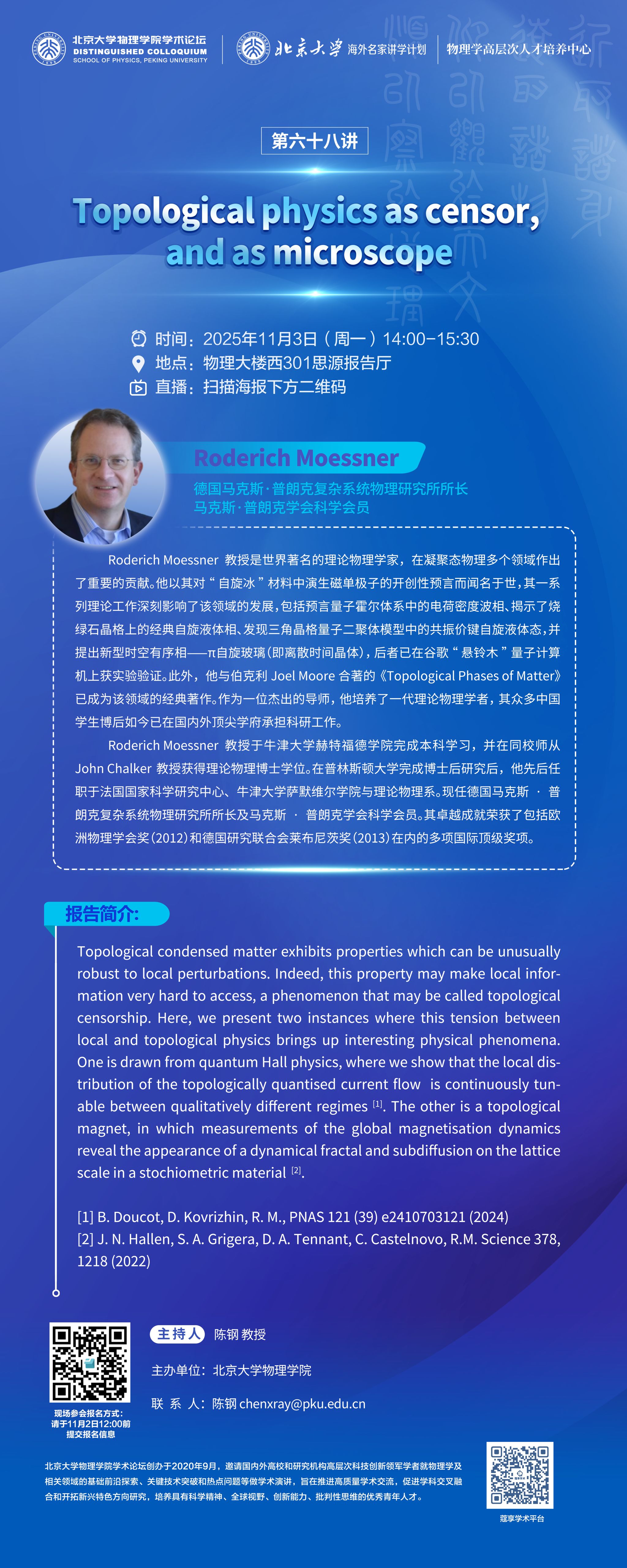Roderich Moessner教授是世界著名的理论物理学家,在凝聚态物理多个领域作出了重要的贡献。他以其对“自旋冰”材料中演生磁单极子的开创性预言而闻名于世,其一系列理论工作深刻影响了该领域的发展,包括预言量子霍尔体系中的电荷密度波相、揭示了烧绿石晶格上的经典自旋液体相、发现三角晶格量子二聚体模型中的共振价键自旋液体态,并提出新型时空有序相——π自旋玻璃(即离散时间晶体),后者已在谷歌“悬铃木”量子计算机上获实验验证。此外,他与伯克利Joel Moore院士合著的《Topological Phases of Matter》已成为该领域的经典著作。作为一位杰出的导师,他培养了一代理论物理学者,其众多中国学生博后如今已在国内外顶尖学府承担科研工作。