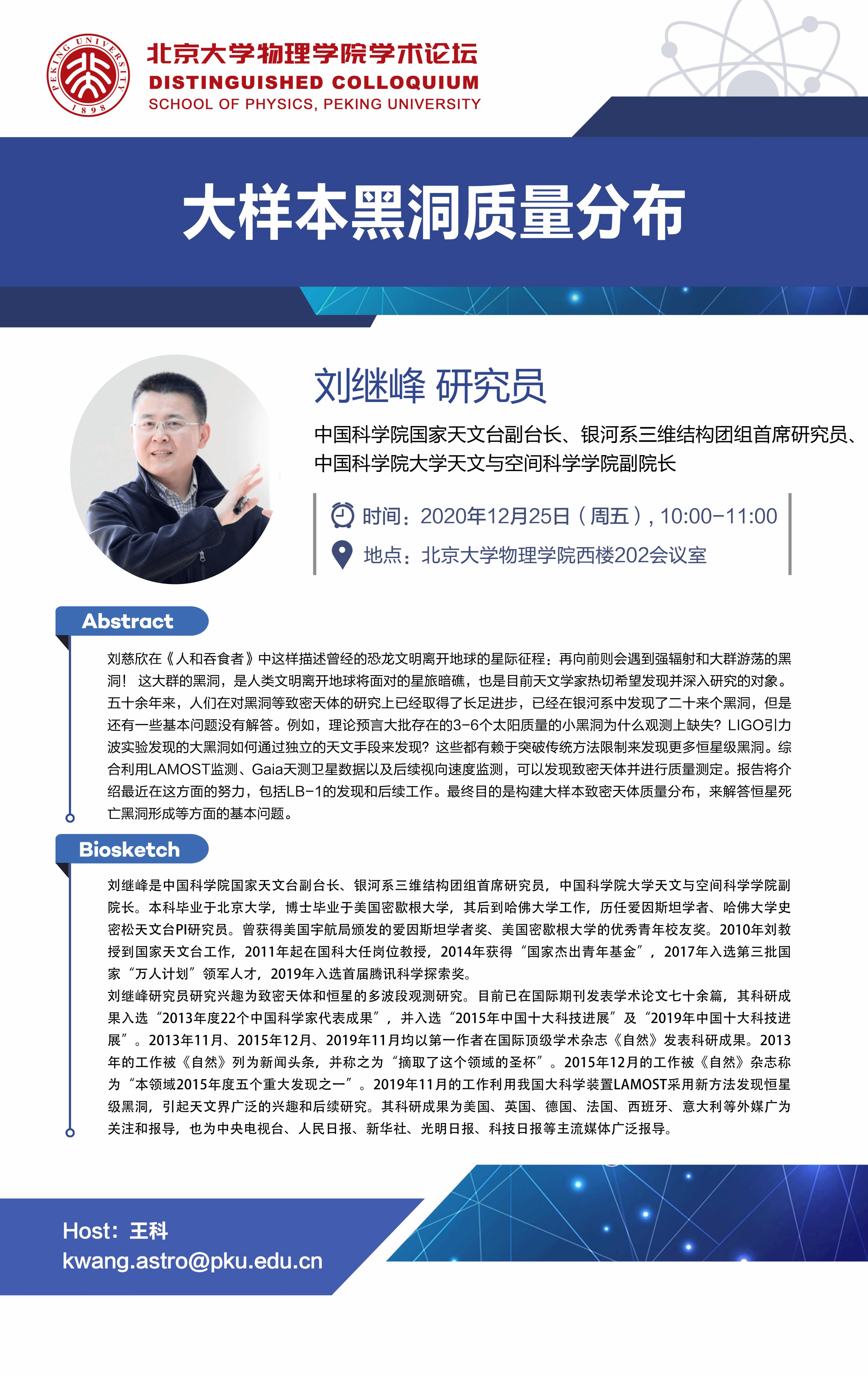 报告人简介:刘继峰是中国科学院国家天文台副台长、银河系三维结构团组首席研究员,中国科学院大学天文与空间科学学院副院长。本科和硕士毕业于北京大学天体物理专业,博士毕业于美国密歇根大学,其后到哈佛大学工作,历任爱因斯坦学者、哈佛大学史密松天文台PI研究员。曾获得美国宇航局颁发的爱因斯坦学者奖、美国密歇根大学的优秀青年校友奖。2010年在中国科学院国家天文台工作,2011年起在中国科学院大学任岗位教授,2014年获得“国家杰出青年基金”,2017年入选第三批国家“万人计划”科技创新领军人才,2019年入选首届腾讯科学探索奖。刘继峰研究兴趣为致密天体和恒星的多波段观测。目前已在国际期刊发表学术论文七十余篇,其科研成果入选“2013年度22个中国科学家代表成果”,并入选“2015年中国科学十大进展”及“2019年中国科学十大进展”。2013年11月、2015年12月、2019年11月均以第一作者在国际顶级学术杂志《自然》发表科研成果。2013年的工作被《自然》列为新闻头条,并称之为“摘取了这个领域的圣杯”。2015年12月的工作被《自然》杂志称为“本领域2015年度五个重大发现之一”。2019年11月的工作利用我国大科学装置LAMOST采用新方法发现恒星级黑洞,引起天文界广泛的兴趣和后续研究。其科研成果为美国、英国、德国、法国、西班牙、意大利等外媒广为关注和报道,也为中央电视台、人民日报、新华社、光明日报、科技日报等主流媒体广泛报道。