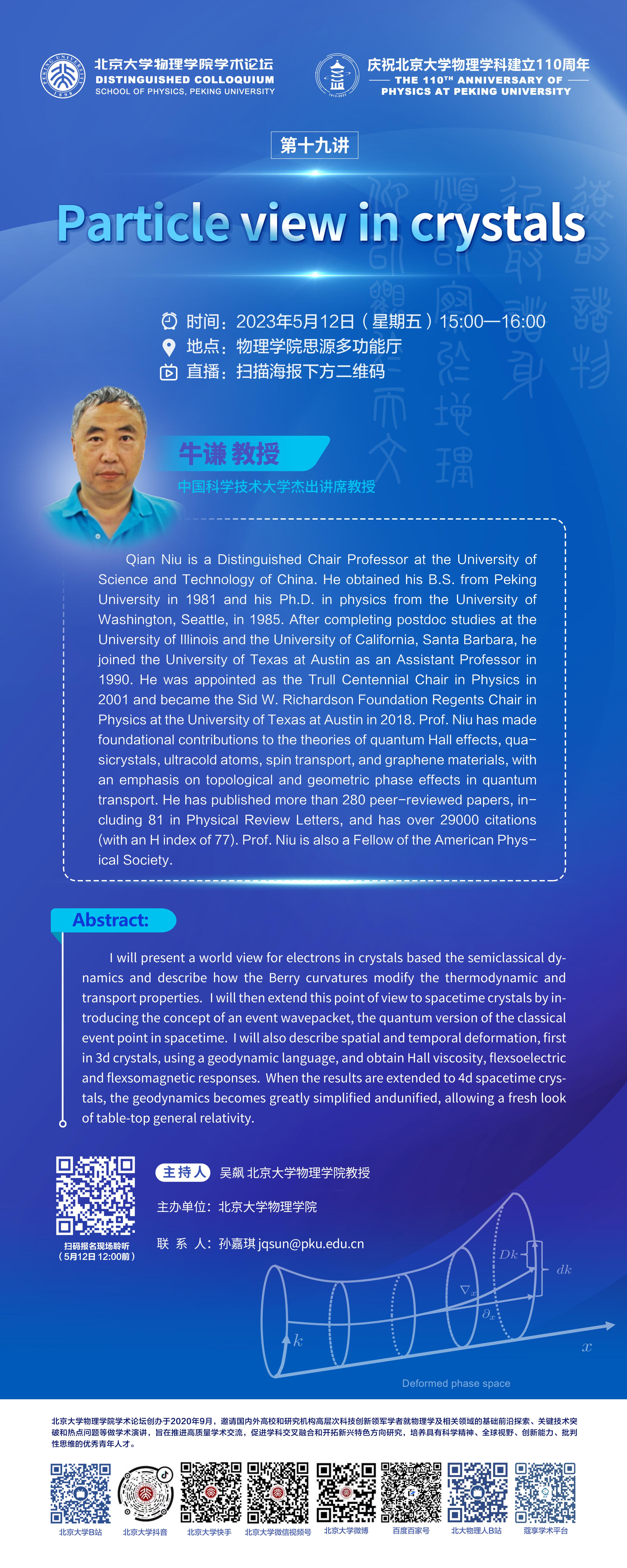Qian Niu is a Distinguished Chair Professor at the University of Science and Technology of China. He obtained his B.S. from Peking University in 1981 and his Ph.D. in physics from the University of Washington, Seattle, in 1985. After completing postdoc studies at the University of Illinois and the University of California, Santa Barbara, he joined the University of Texas at Austin as an Assistant Professor in 1990. He was appointed as the Trull Centennial Chair in Physics in 2001 and became the Sid W. Richardson Foundation Regents Chair in Physics at the University of Texas at Austin in 2018. Prof. Niu has made foundational contributions to the theories of quantum Hall effects, quasicrystals, ultracold atoms, spin transport, and graphene materials, with an emphasis on topological and geometric phase effects in quantum transport. He has published more than 280 peer-reviewed papers, including 81 in Physical Review Letters, and has over 29000 citations (with an H index of 77). Prof. Niu is also a Fellow of the American Physical Society.