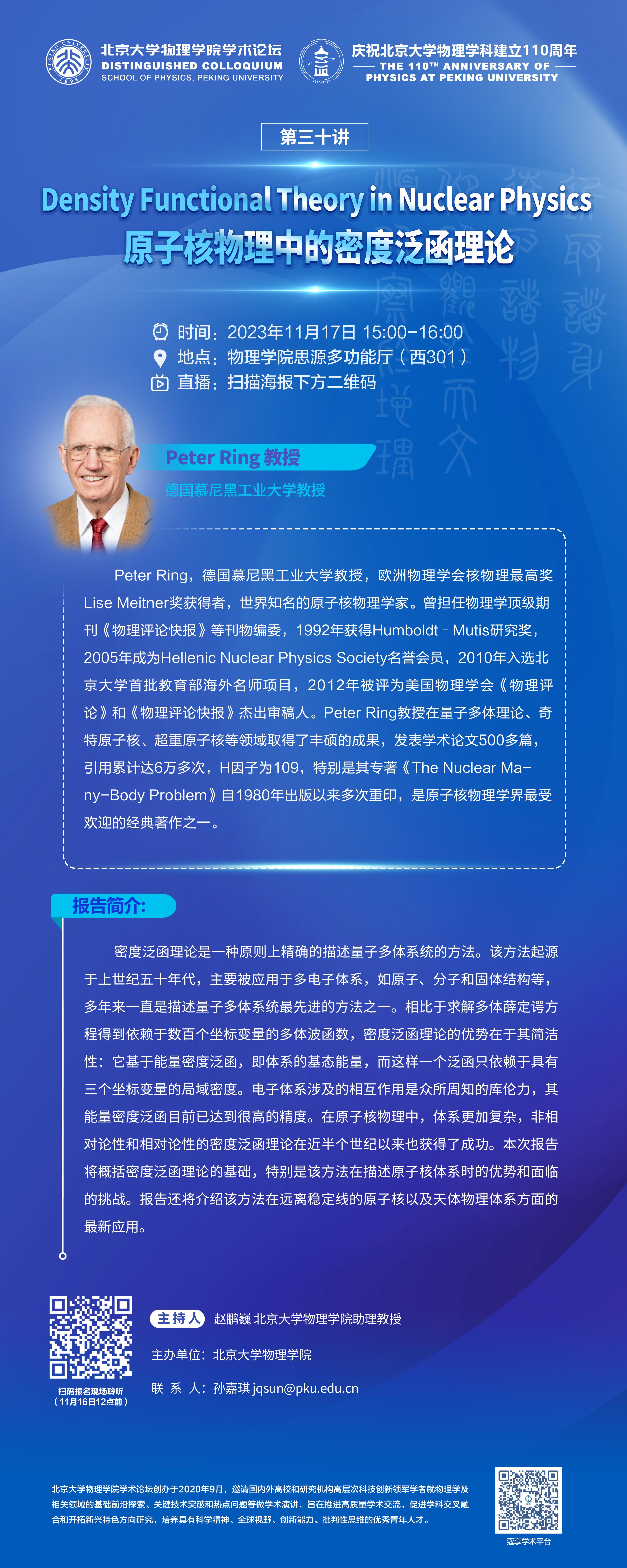 Peter Ring,德国慕尼黑工业大学教授,欧洲物理学会核物理最高奖Lise Meitner奖获得者,世界知名的原子核物理学家。曾担任物理学顶级期刊《物理评论快报》等刊物编委,1992年获得Humboldt–Mutis研究奖,2005年成为Hellenic Nuclear Physics Society名誉会员,2010年入选北京大学首批教育部海外名师项目,2012年被评为美国物理学会《物理评论》和《物理评论快报》杰出审稿人。Peter Ring教授在量子多体理论、奇特原子核、超重原子核等领域取得了丰硕的成果,发表学术论文500多篇,引用累计达6万多次,H因子为109,特别是其专著《The Nuclear Many-Body Problem》自1980年出版以来多次重印,是原子核物理学界最受欢迎的经典著作之一。