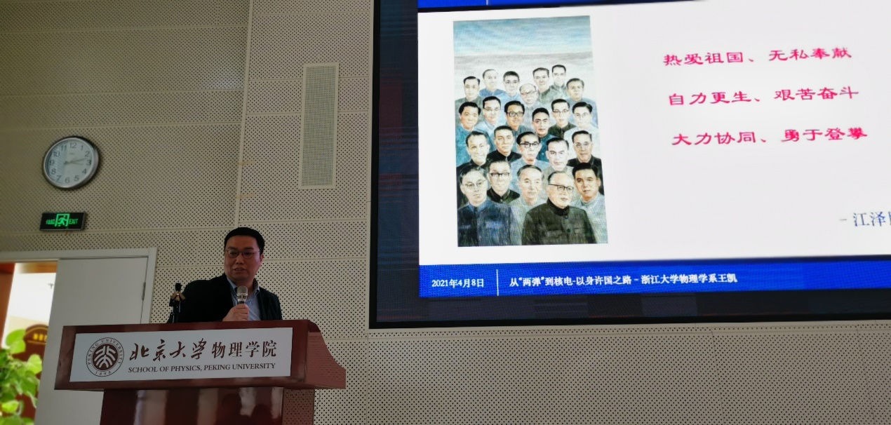 2021年4月8日下午,物理学院、化学与分子工程学院、工学院于物理学院西301思源报告厅联合举办“传承‘两弹’精神,勇担时代使命”党史学习报告会。浙江大学物理系副系主任王凯、北京大学物理学院党委副书记穆良柱、化学与分子工程学院团委书记侯梦旭、工学院团委常务副书记袁苗苗以及100余位党员、团员同学参加会议。报告会由物理学院团委书记张帆主持。