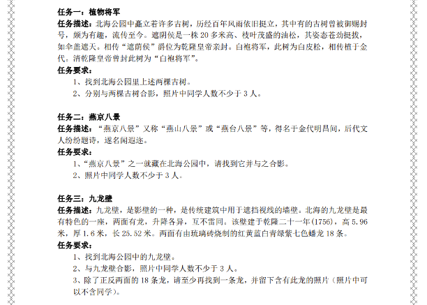 活动开始前,团支书和支部部分同学进行了交流探讨,并结合实地考察经验,精心设计了本次活动。本次活动结合北海公园具体景点,设置了公园内多个地点的打卡任务,从而发扬支部同学团队合作精神,同时使活动具有较高的自由度。活动结束后,支部将根据同学们任务完成数颁发奖品。