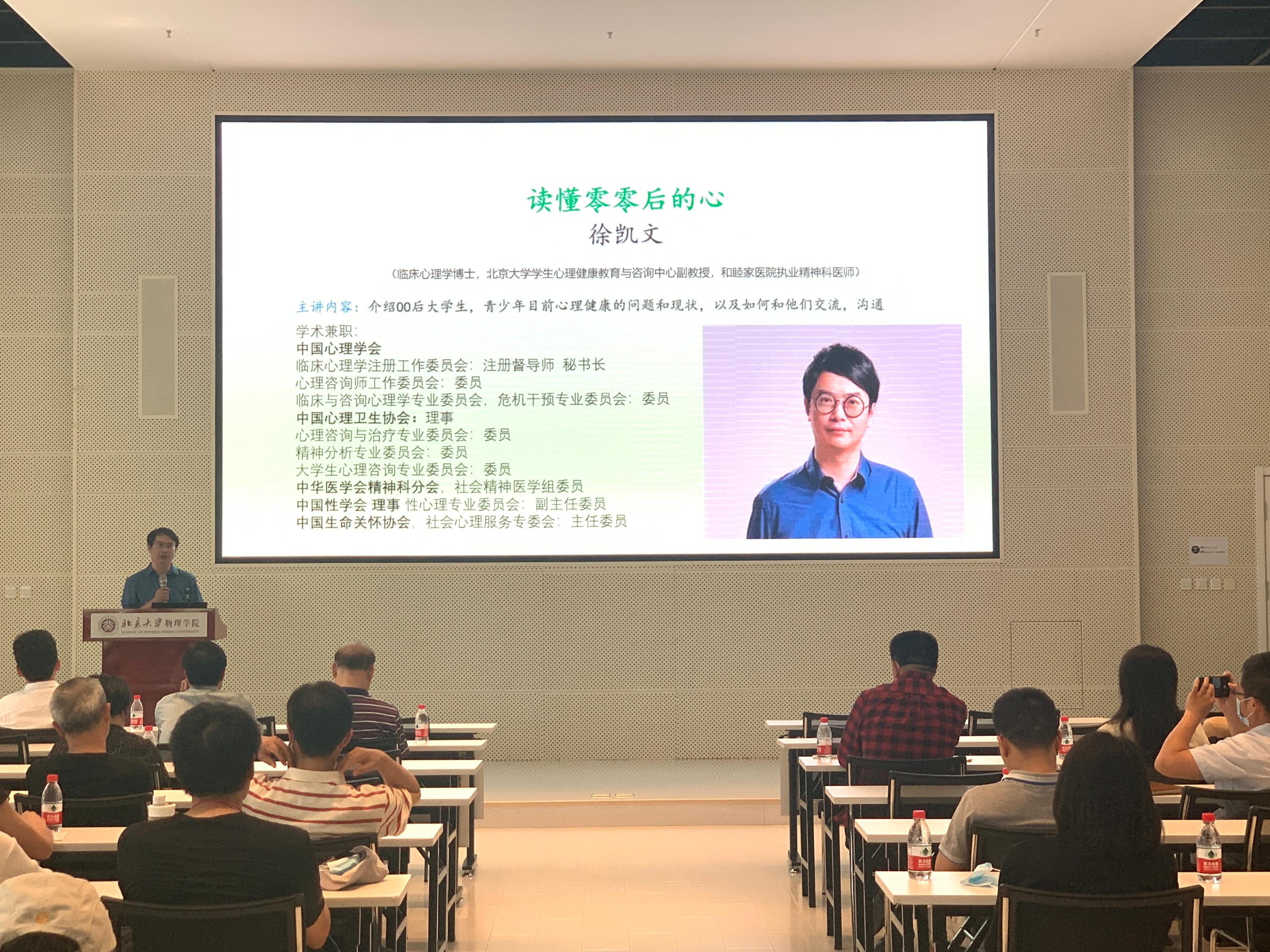 2021年6月22日,北京大学物理学院“强化师德师风建设,深化心理健康教育”专题讲座在物理西楼思源多功能厅举办。北京大学学生心理健康教育与咨询中心专职咨询师徐凯文副教授应邀作了题为“帮你读懂网络时代‘零零后’的心” 的报告。讲座由学院教师思想政治和师德师风委员会委员、2021级本科生年级主任王思广副教授主持。学院党委理论学习中心组部分成员以及来自各教工党支部的党员和其他一线教师40余人现场聆听。
