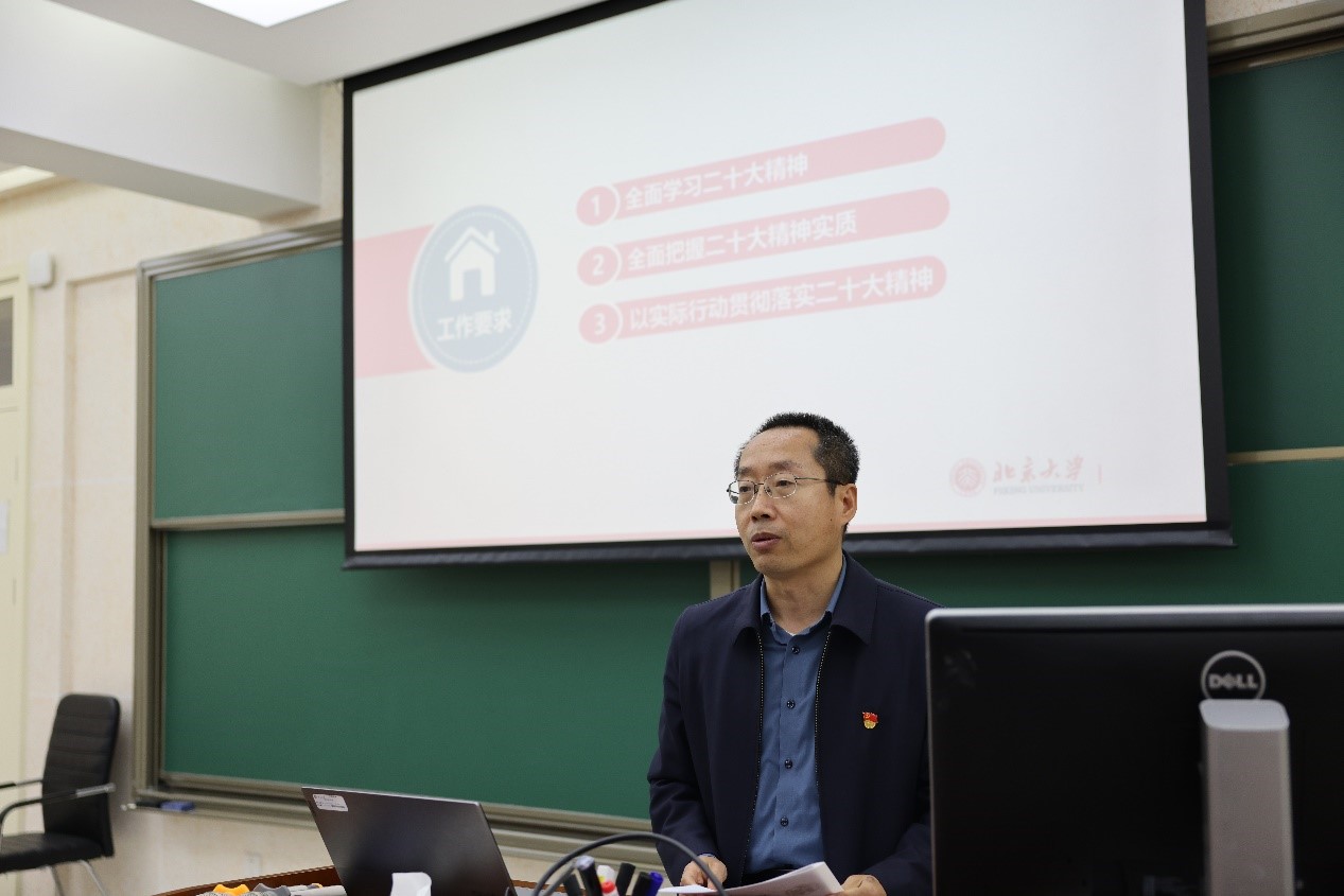刘雨龙就做好二十大精神学习贯彻工作进行了具体部署,指出要从全面学习党的二十大精神,全面把握党的二十大精神实质,以实际行动贯彻落实党的二十大精神三个方面着手,以贯彻党中央决策部署为前提,按照学校第十四次党代会和学校党委的部署要求,全面把握新时代推动“双一流”高质量建设,扎根中国大地建设世界一流大学的根本要求,结合自身工作实际,切实把广大党员师生的思想和行动统一到党的二十大精神上来,推动学院在党的建设和事业发展上取得新的突出成绩。各党支部要落实首要议题制度,读原文、悟原理,全面系统学、及时跟进学、联系实际学,认真组织学报告、学党章、讲党课、听讲座等工作,并主动开展实践活动,营造良好学习氛围。