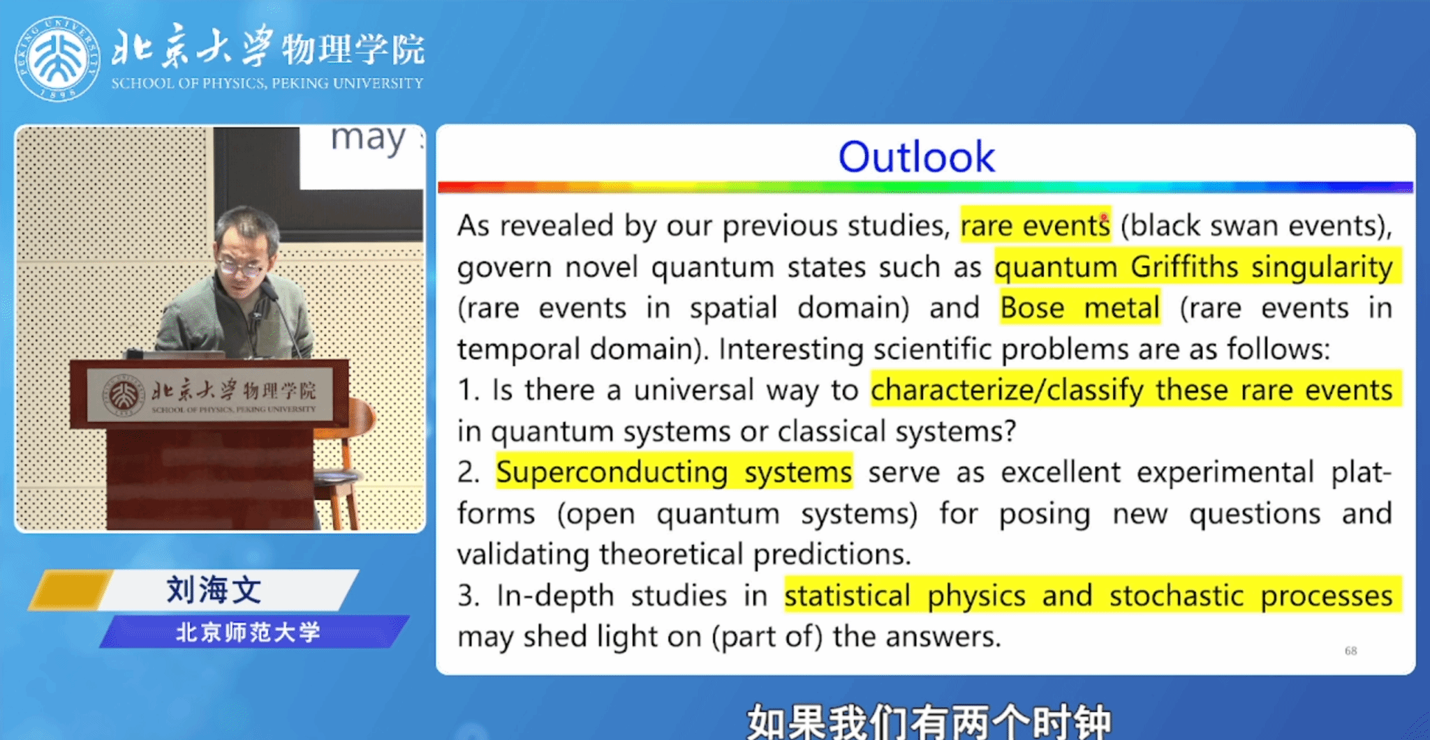 接下来,刘老师介绍了他更早期的两个工作:量子格里菲斯奇异性和量子玻色金属态。他们在空间中存在一些稀有但影响巨大的区域,导致了其看起来具有与实验上时钟不同的内禀时钟。最终,这些系统同样表现出一些稀有事件支配的超慢动力学特征,与Anderson玻璃态中对数老化行为具有深刻的联系。