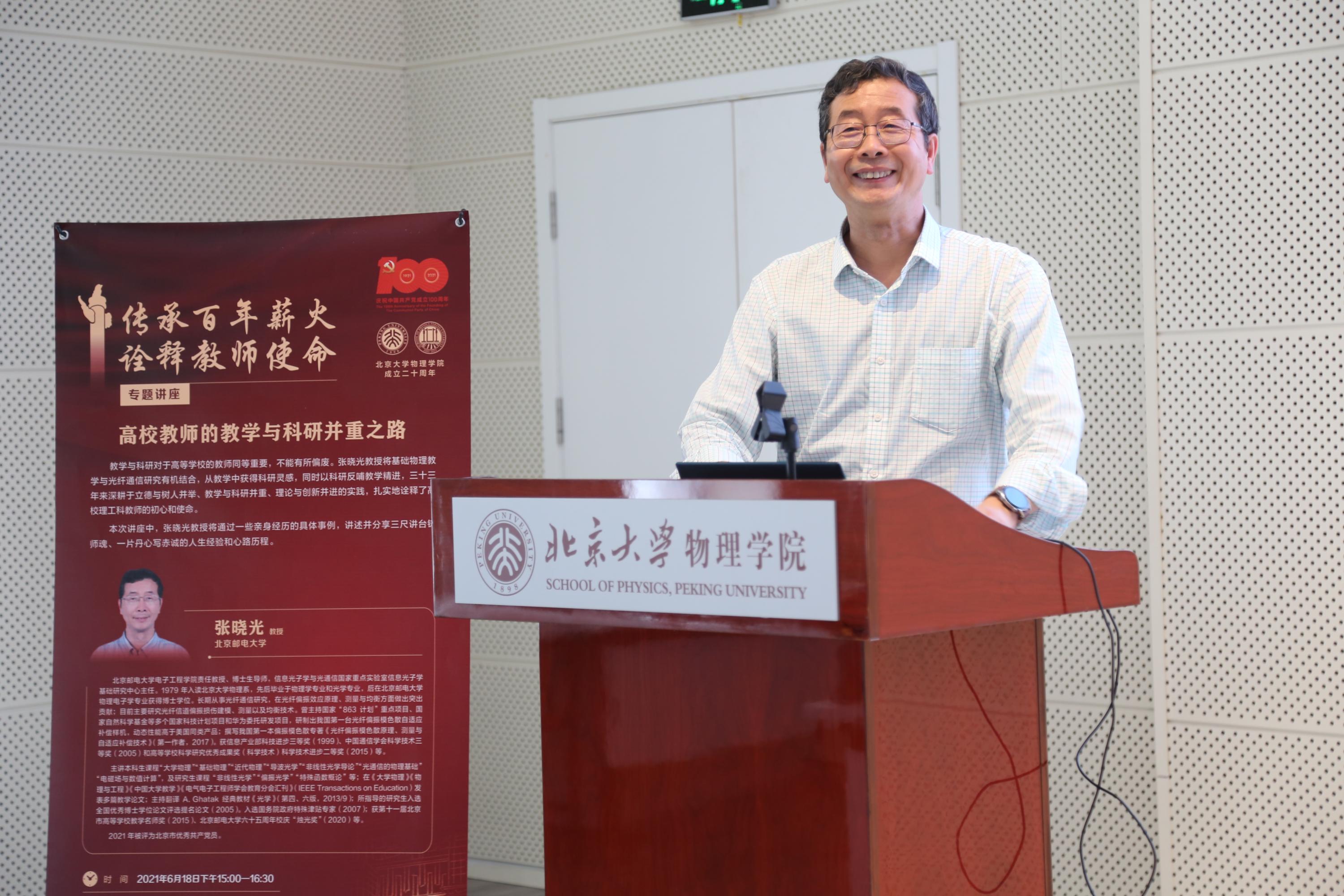 本次专题讲座是物理学院党委组织开展党史学习教育主题活动的重要环节,也是物理学院成立二十周年系列活动的重要内容;得到北京大学化学与分子工程学院、区域光纤通信网与新型光通信系统国家重点实验室的支持。