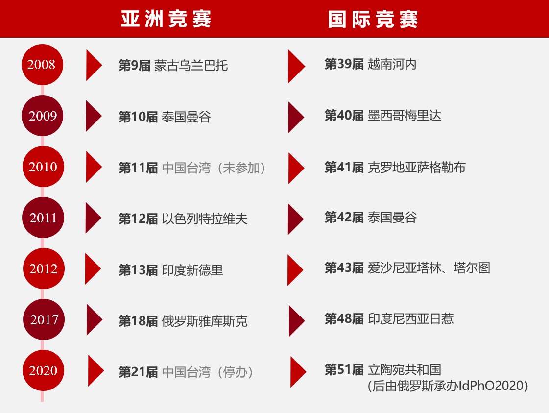 2005年,物理学院向中国物理学会物理教学委员会提出申请,承担自2007年起连续四年的全国竞赛集训队的承训工作,并获得批准;后因故实际连续承担2007—2008年度至2011—2012年度的集训工作,共五年。2012年之后,作为全国竞赛集训队承训大学联盟单位,学院又承担了2016—2017年度和2019—2020年度的集训队工作。按计划,本应分别参加相应年度的7次亚洲竞赛和7次国际竞赛(见下表),但出于在台湾承办及新型冠状病毒肺炎疫情影响等原因,中国队未能参加其中的两次亚洲竞赛。