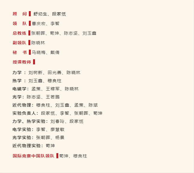 2020年,物理学院第三度负责全国竞赛集训队工作,由老中青三代教师共同实施(教师名单见下表),顺利完成了队伍过渡。舒幼生提供宏观指导,段家忯参与具体指导;培训、选拔和带队参赛都由中青年教师担纲。