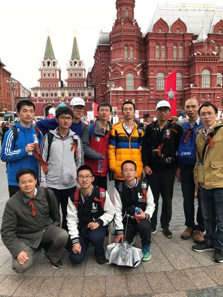 2017年5月9日,第18届亚洲竞赛中国队在莫斯科红场附近参加俄罗斯卫国战争胜利72周年游行(前排左一:陈晓林;后排右一:杨景,右二:穆良柱)