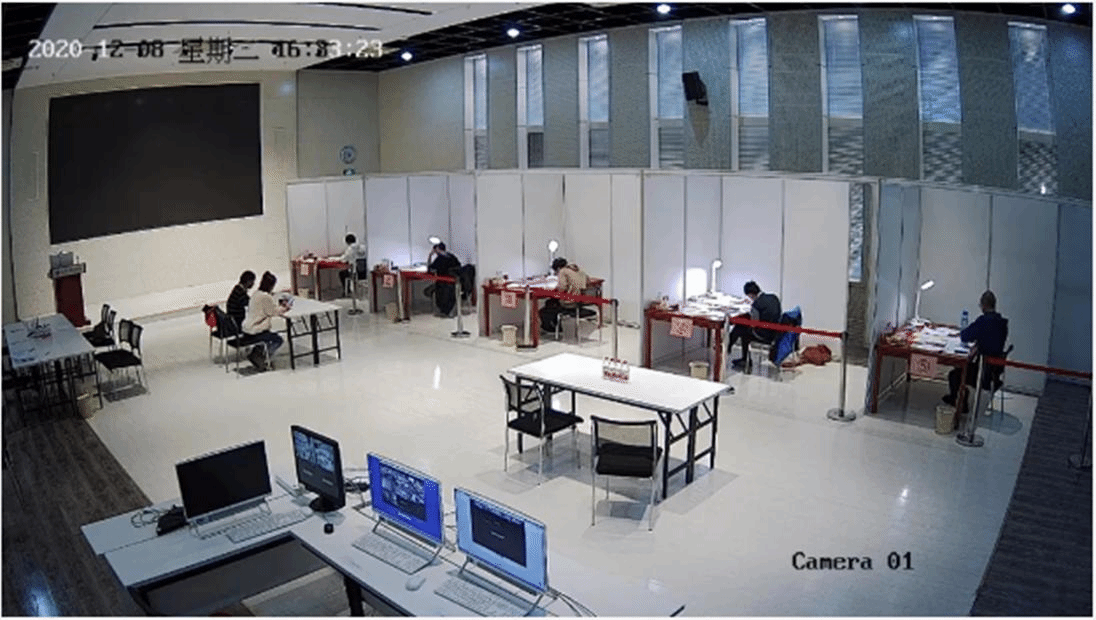 IdPhO2020中国赛区考试现场的中国队员和监考专员(左一、左二)