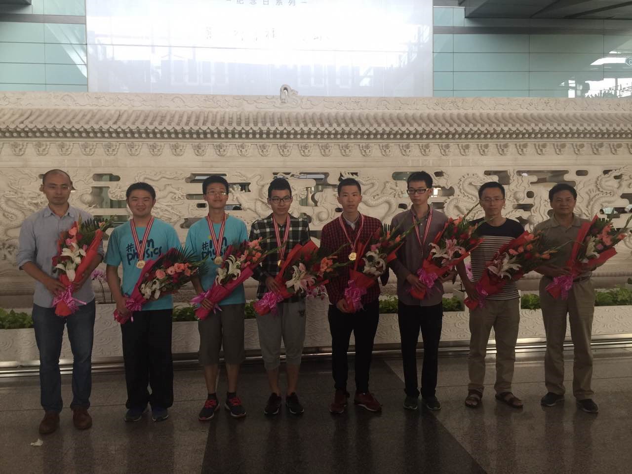第48届国际竞赛中国队返京后在首都机场受到部分队员所在中学师生和亲友的欢迎(左一:穆良柱;右一:陈晓林,右二:杨景)